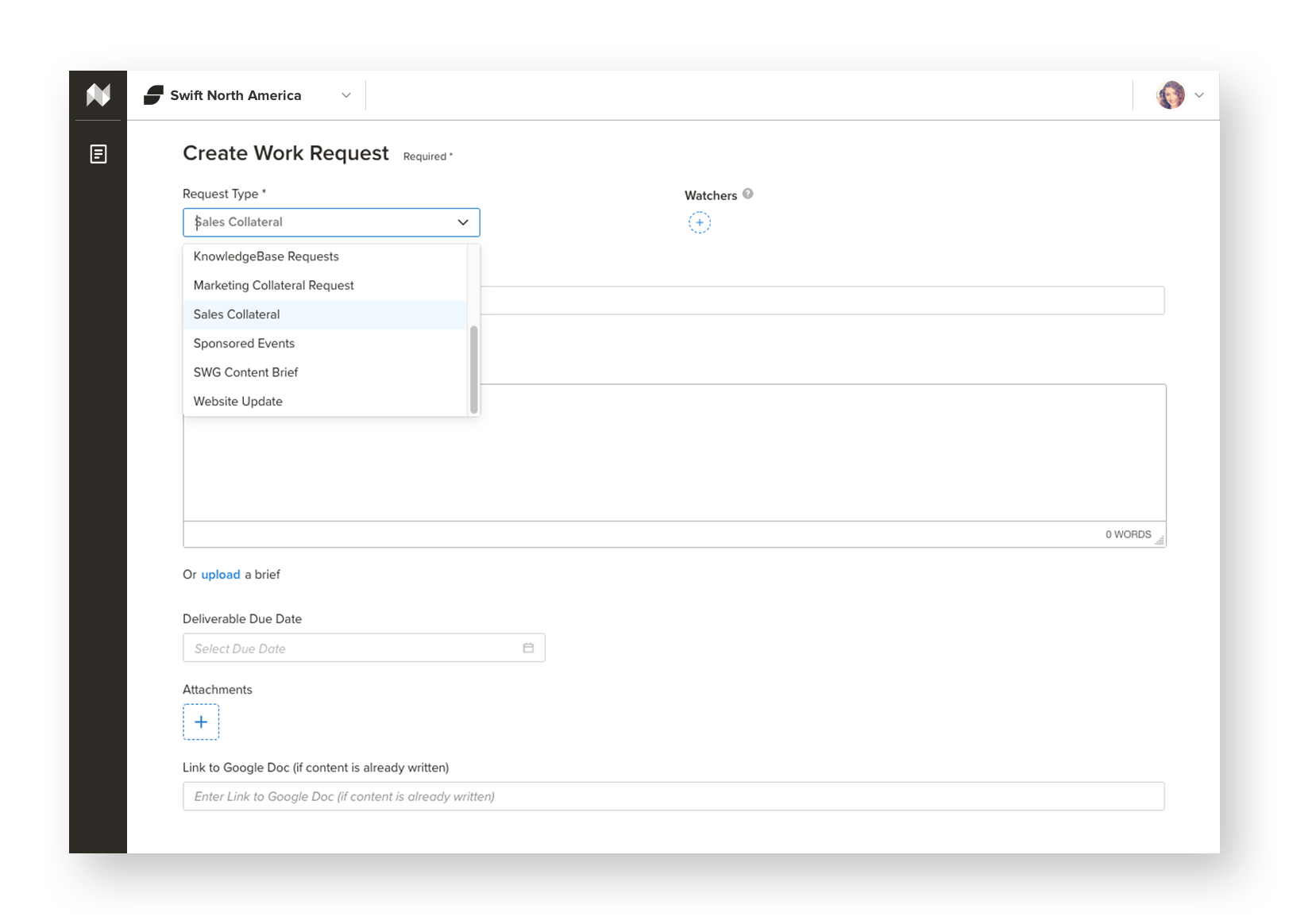 - Customizable Form Builders, which allow us to meet the needs of every global stakeholder by configuring a variety of templates — such as “Case Study” or “Sales Deck” — along with relevant associated fields. Accessible as a dropdown on the work intake form, these pre-approved templates not only provide structure for the requester, but ensure all of our team members have the relevant information needed to complete the request.